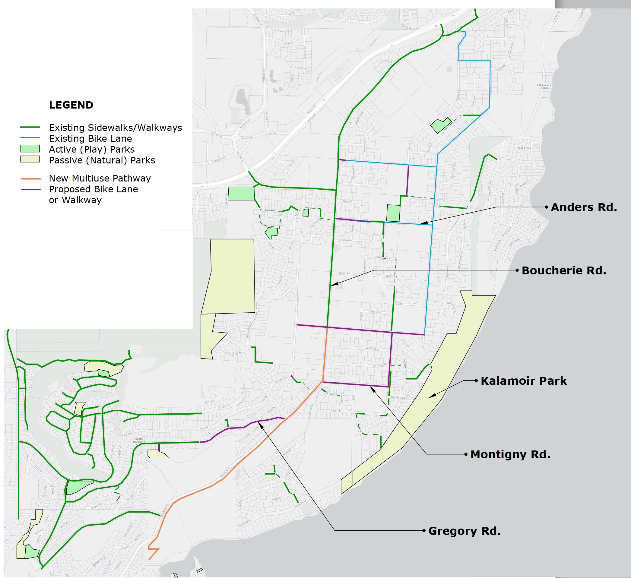 The CWK also has a challenge in our neighbourhood with respect to paths. The map that they show highlighting current paths is not accurate. For example, they show Boucherie Road as a bike path from Ogden Road to Pritchard Drive and they claim that there is a bike path from Thacker Drive to Boucherie Road. These paths do not exist at this time, leaving us with narrow roads with no room for bicycles or pedestrians. Part of this error is being addressed by the latest Boucherie Multi-use Pathway Project, but many gaps remain.